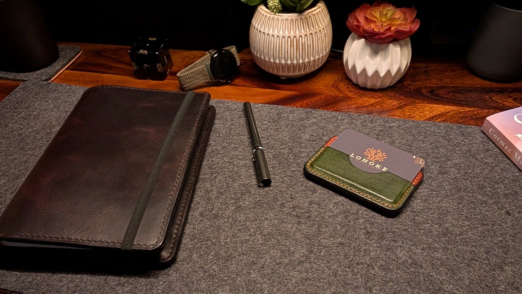Welcome to the full Lonoke Designs collection. We offer handcrafted desk and everyday carry accessories made in Texas by Texans. From hardwood wrist rests and wool desk pads to leather wallets and journal covers, each piece is built with intention, quality, and timeless craftsmanship. Find your next piece below.