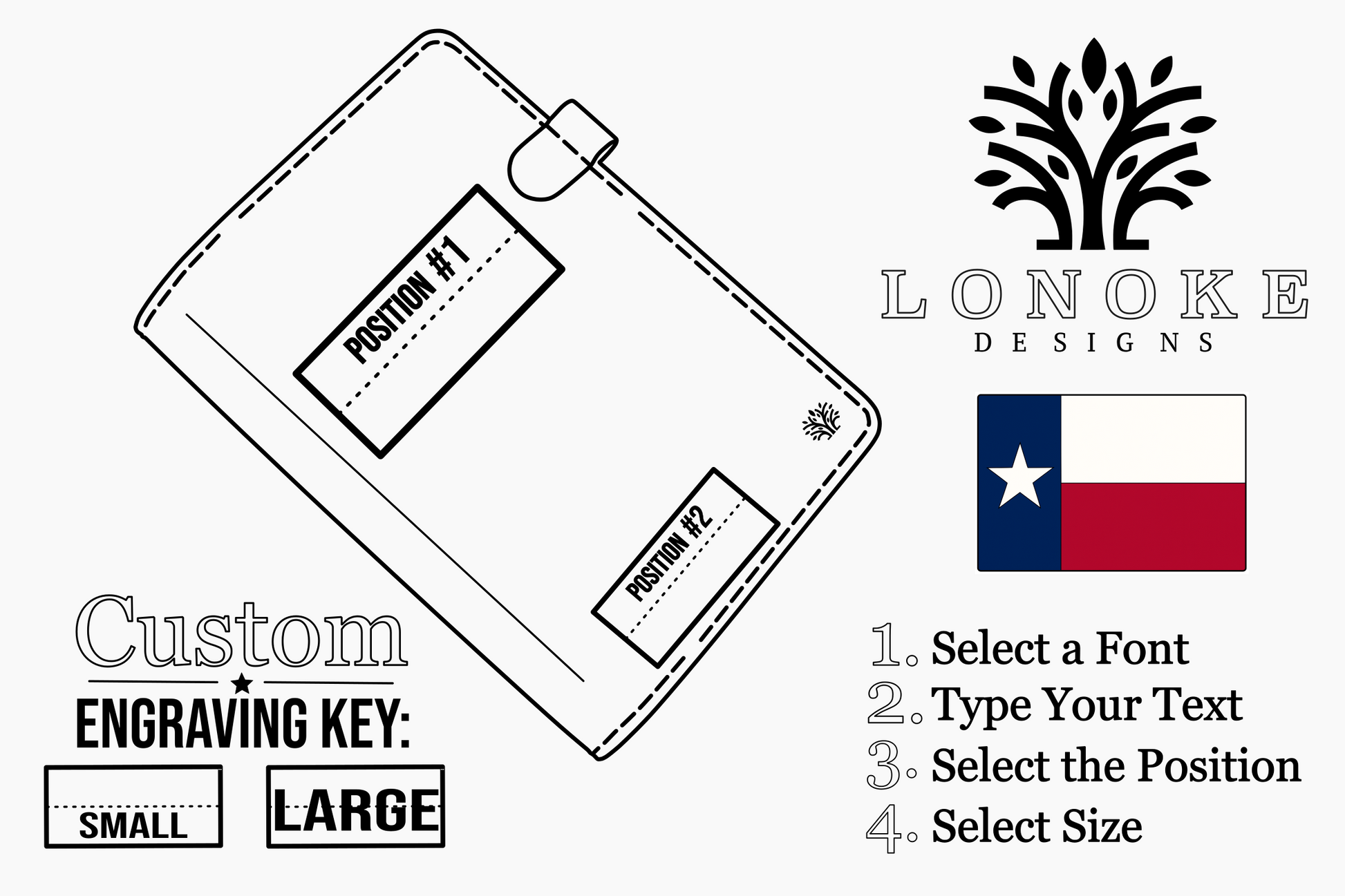Add a personal touch with custom engraving. Always done in-house at our Fort Worth, TX workshop. Just $5 to make it your own. See photo diagram for placement.