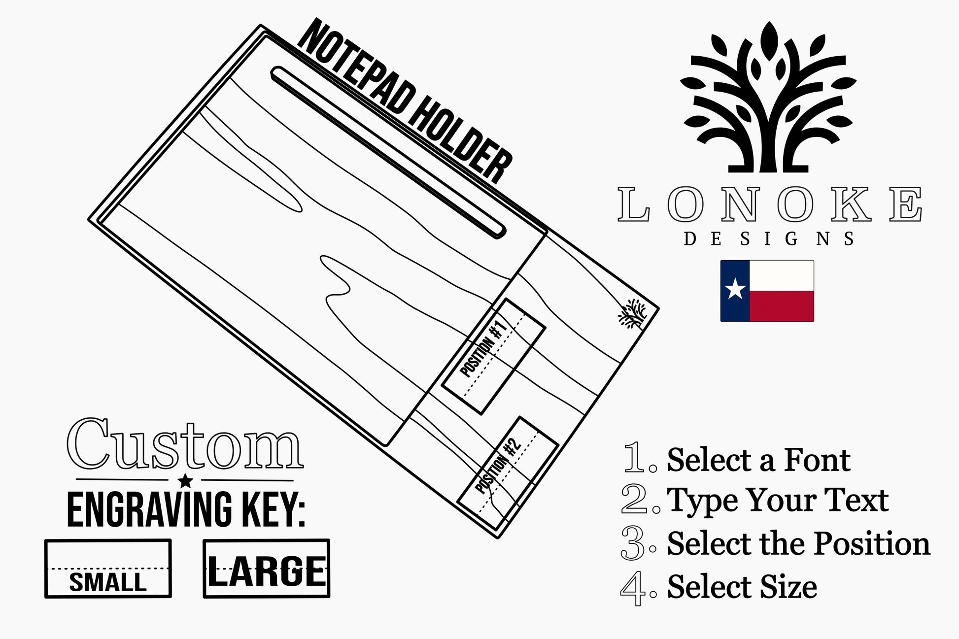 Add a personal touch with custom engraving. Always done in-house at our Fort Worth, TX workshop. Just $5 to make it your own. See photo diagram for placement.